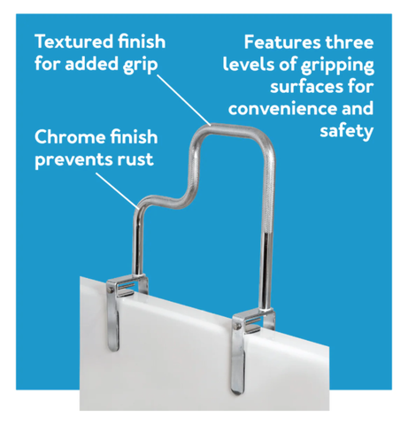 The Tri Grip Bathtub Rail has three convenient gripping areas to make getting in and out of the bathtub easier. This Bathtub Rail features an attractive chrome finish that inhibits rust and gripping areas with textured finishes. This rail fits most bathtubs.